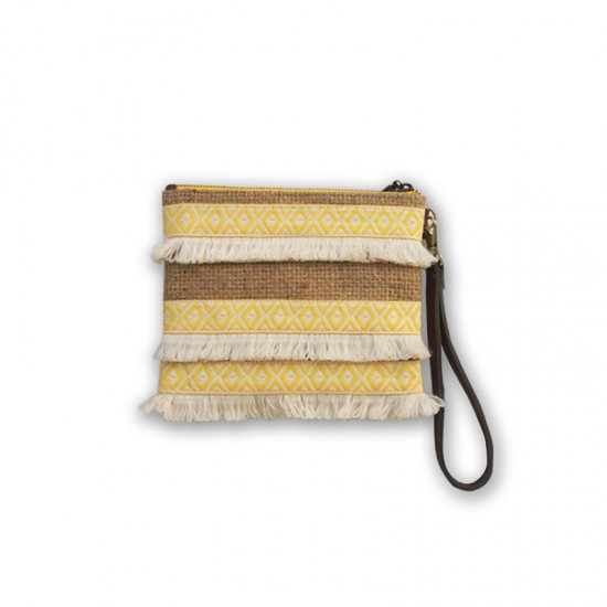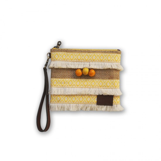 Material – Up-cycled Burlap (from Dimattina Coffee sack) | Genuine leather | Cotton | Woven ribbon | Fringe | Wooden Bead finger loop